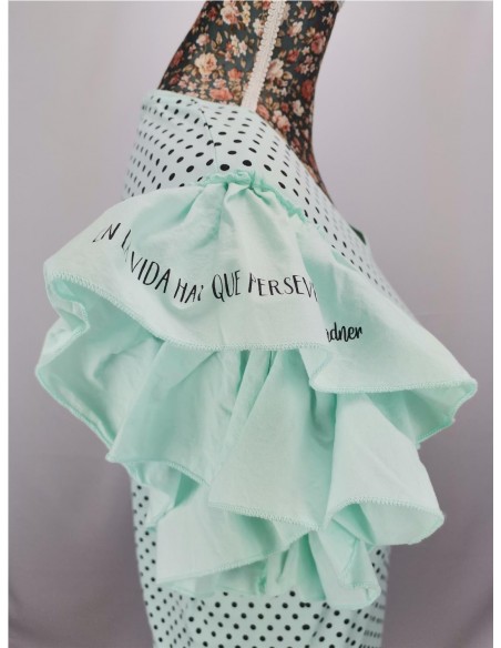 Camiseta inspirada en la frase de Ava Gardner: «Aprendí que en la vida hay que perseverar». Esta prenda es la fusión de uno de sus icónicos vestidos de color verde con lunares y escote cuadrado, con las mangas de volantes de los trajes de sevillana. Ava Gardner vivió muchos años en España y le encantaban nuestras tradiciciones flamencas. El estampado de lunares era uno de sus preferidos, tanto para los rodajes como para su vida diaria. No era solo una actriz con una cara bonita, su fuerza trasp